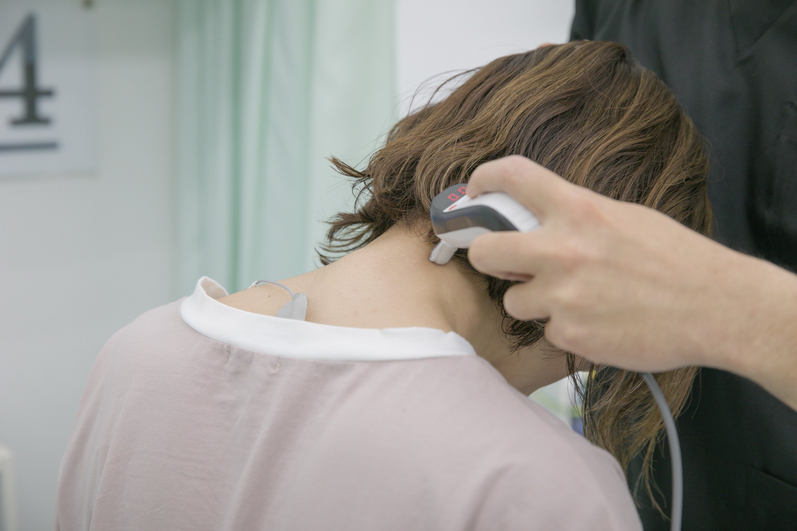 ハイボルトで炎症を鎮め、過剰に緊張した深層筋を緩めることで、首の可動域の早期改善を目指します。
